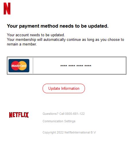 If you are still on the fence about an email? Contact the company by looking up the phone number or email using the actual company's website. So in this example i would goto Netflix.com and get their company phone number. Plus, simple mistakes like 0800 instead of 1-800 is key signs of a fake email.